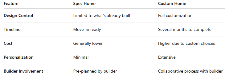 If time is your top priority, spec homes offer convenience. If individuality matters more, custom homes are the answer.